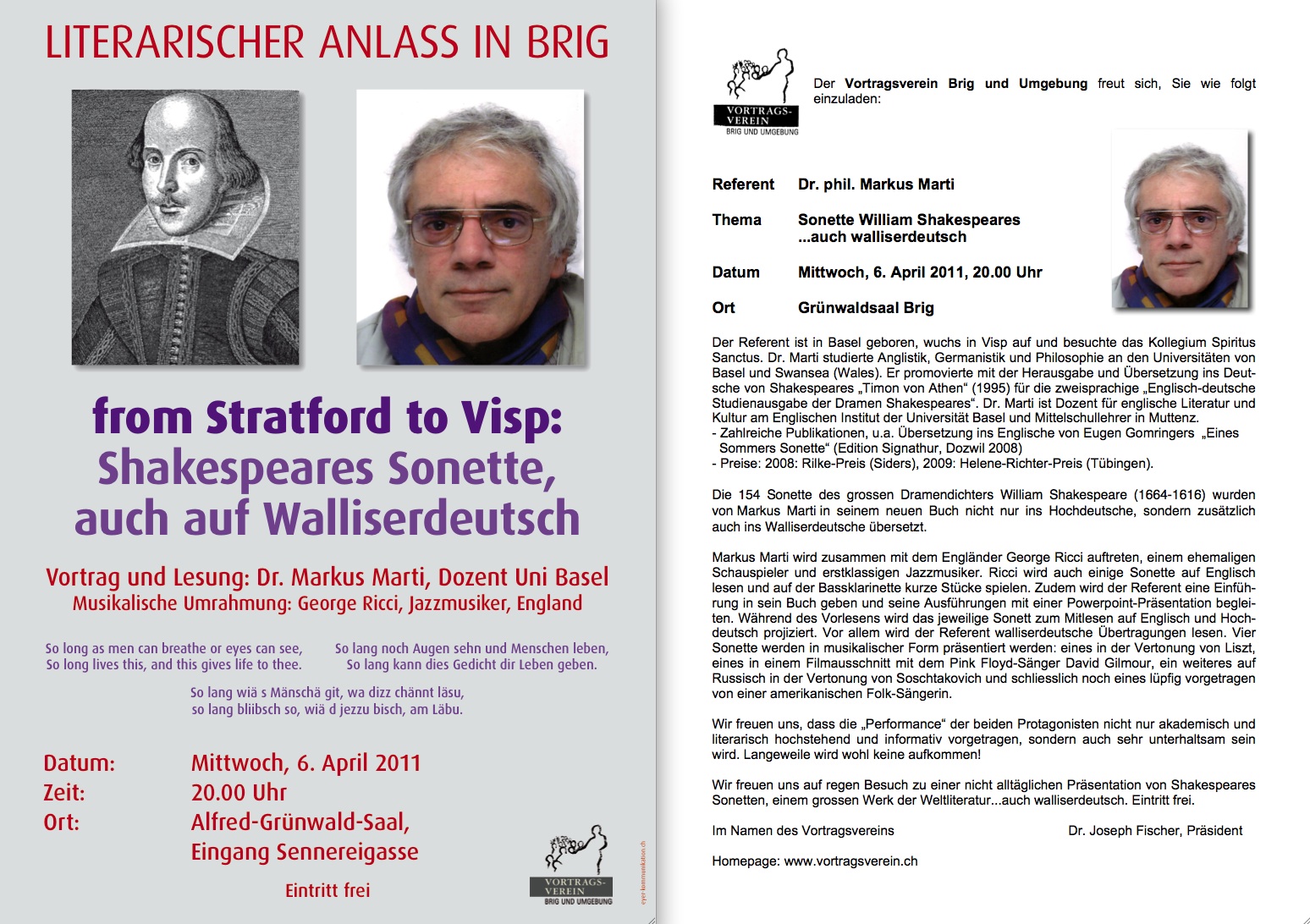 (Aus dem Vorwort von Bruno Oetterli zum Buch von Markus Marti: William Shakespeare Sonnets-Sonette, englisch, deutsch und wallissertitsch)