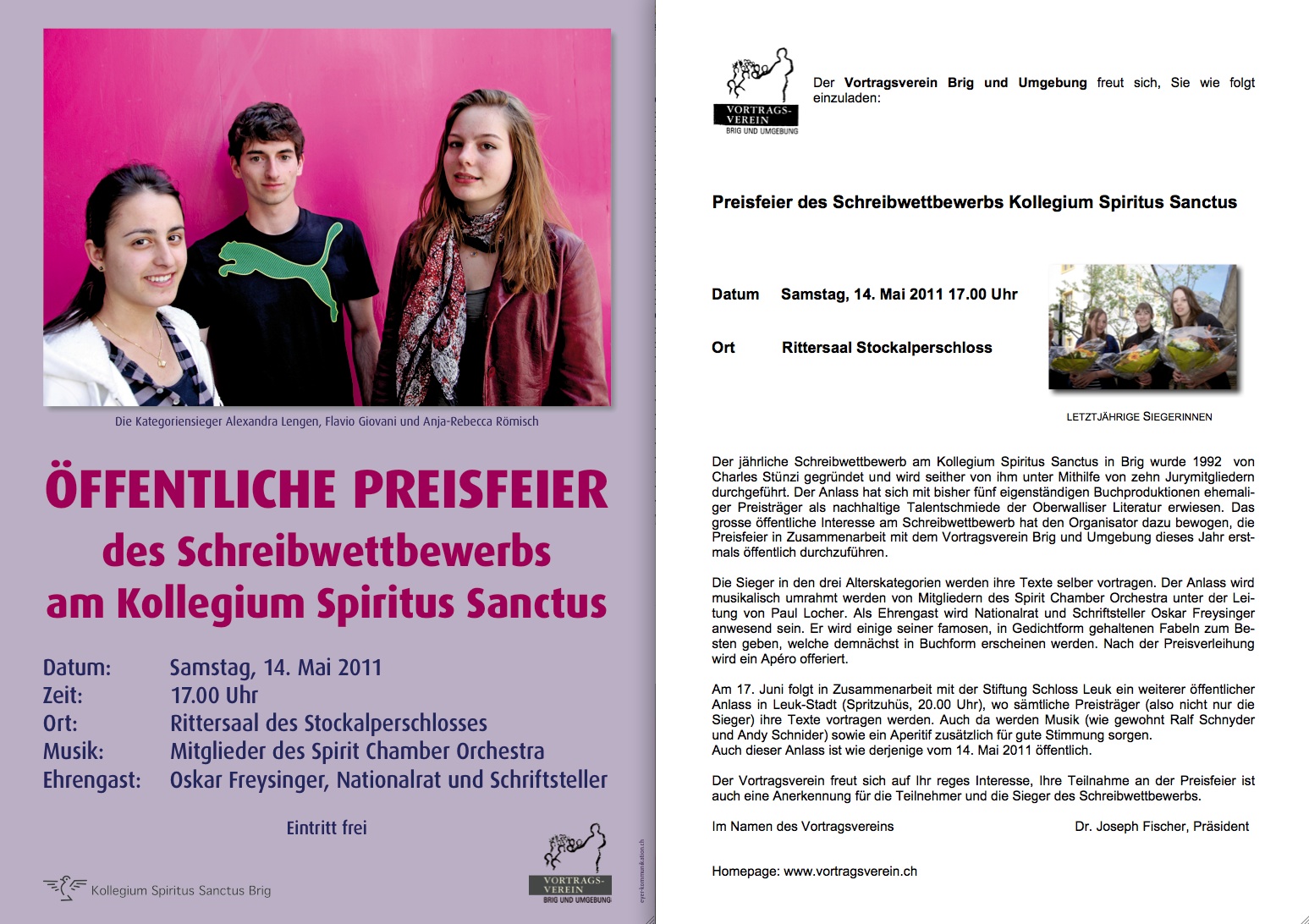 Eingeteilt in drei Alterskategorien durften die Preisträger ihre Preise des Schreibwettbewerbs entgegennehmen und die Geehrten lasen alsdann ihre Gewinnertexte. Umrahmt wurde die Feier durch schöne Klänge von Mitgliedern des Spirit Chamber Orchestras. Oskar Freysinger rezitierte fabelartige, zum Schmunzeln anregende Kurzgedichte aus seiner eigenen Dichterwerkstatt. Ein ansprechender und würdiger Rahmen im Rittersaal trug zur Ambiance des Anlasses das Seine bei.
