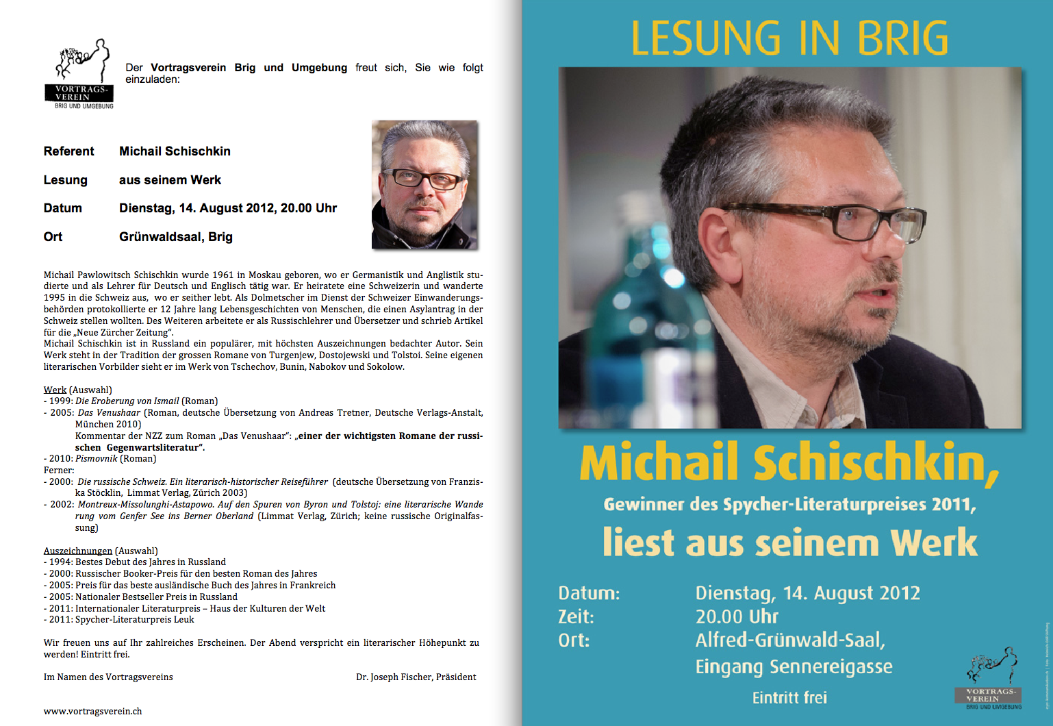 Michail Schischkin ist einer der prominentesten Vertreter der russischen Gegenwartsliteratur, er erhielt für sein Werk und seine Bücher viele namhafte russische und deutsche Literaturpreise, auch den lokalen Spycher-Literaturpreis. Michail Schischkin las aus seinem Buch „Venushaar“ drei Passagen und vermittelte einen nachhaltigen Eindruck seiner Schriften für die zahlreichen Zuhörer, die damit motiviert wurden, sein literarisches Werk kennenzulernen. Michail Schischkin erzählte im Anschluss an seine Lesung interessante Details aus seinem Schaffen und vermittelte auch interessante Begebenheiten aus seiner Biographie.
