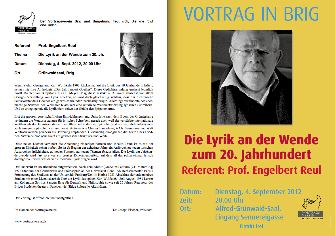 Die Lyrik nach Johann Wolfgang Goethe wurde im 19. Jh. lange Zeit vom Weimarer Dichterfürsten geprägt. Man wagte nicht, andere als die von Goethe vorgezeichneten Wege einzuschlagen. Erst weitere gesellschaftliche Entwicklungen führten gegen Ende des 19. Jh. zu neuen Formen und Ausdrucksmöglichkeiten. Diese Übergangszeit zur modernen, heutigen Lyrik wurde durch den Referenten in eindrücklicher Weise dargestellt und durch Lyrikbeispiele ergänzt.